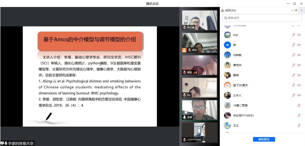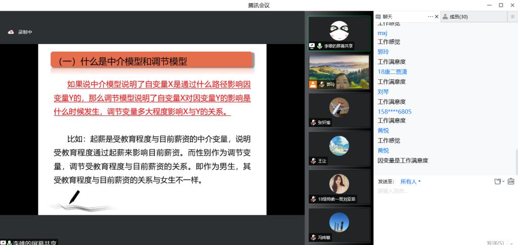 讲座开始前,郭玲博士对李雄老师的个人情况进行了介绍。李雄老师长期从事心理学相关研究,擅长数据分析,取得了丰硕的相关科研成果。接着,李雄老师介绍了自己近期的科研情况,指出了数据分析在教育科学研究中的重要性,并介绍了讲座的具体内容安排。随后,李老师为大家细致讲解了什么是中介模型和调节模型,并演示了如何用SPSS和Amos软件检验中介模型和调节模型。整场讲座中,老师通过例举具体研究案例,软件操作演示配合讲解,深入浅出地讲授了中介模型和调节模型的数据分析方法,在讲授过程中参会人员纷纷与李老师互动交流,云讲座氛围积极融洽。